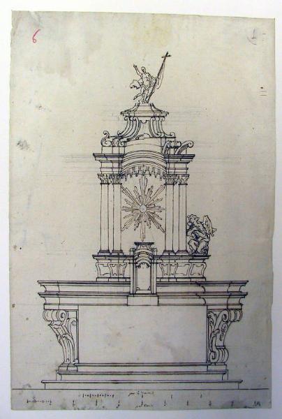 - NOTIZIE STORICO CRITICHE Nel contratto del 1 dicembre 1739 i Buzzi si impeganavano a eseguire l'altare secondo il disegno, con i marmi "descritti in lista alfabeteta", e di consegnare l'opera nel marzo del 1742. Si tratta, dunque, di un disegno non definitivo. I due Buzzi avevano già realizzato nel 1733, sempre su disegno di Pietro Ligari, l'altare maggiore della chiesa di S. Giovanni Battista a Morbegno con struttura molto simile a questa. Probabile che l'artista abbia utilizzato il medesimo schema di base per ambedue gli altari. Nella realizzazione dell'altare di Grosio, che venne eseguito secondo la soluzione proposta nella parte destra del disegno, i Buzzi operarono alcune modifiche nell'impostazione dell'arco del ciborio e nella struttura del tabernacolo. Inoltre il Cristo trionfante venne sostituito da un Gesù bambino con la croce. Tali modifiche resero l'altare di Grosio molto simile a quello di Morbegno.