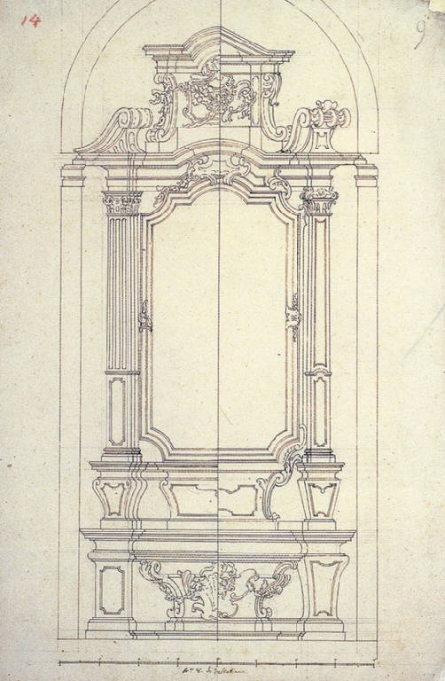 - NOTIZIE STORICO CRITICHE Nel Mastro N (c.81v) Ligari scrive che Carlo Buzzi "ha riceuto il secondo dissegno l'anno 1737 per l'opera ordinatagli per la Cappella del Santissimo Rosario, col quale è unito quello per la cappella di S. Giuseppe", anche se il disegno si trovava nelle mani di Domenico Giuseppe Lavizzari dal 1733. Anche in questo caso i Buzzi ebbero in mano un disegno con le indicazioni di Pietro sui marmi da utilizzare, disegno non conservato, di cui il presente foglio rappresenta evidentemente uno studio preparatorio.