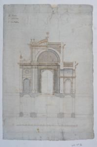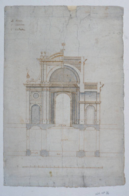 - NOTIZIE STORICO CRITICHE L'edificio doveva essere inserito all'interno di una struttura più complessa, forse un porticato o un terrapieno, i cui muri sono segnati in pianta a continuazione del profilo della costruzione. La Meli Bassi (scheda SBAS 26) mette in relazione il disegno con quelli eseguiti tra il settembre 1737 e il marzo 1738 per il giardino del palazzo in Quadrobio di Domenico Giuseppe Lavizzari. Il Mastro N (c. 67v) registra infatti il 20 settembre 1737 l'esecuzione di un "disegno di un portico in forma di prospettiva teatrale con pianta et alzata (...) quale dovrà servire per una prospetiva in fondo al giardino del palazzo in Quadrobio" e nel marzo del 1738: " un altro dissegno di pianta, alzata, prospetti e spaccati per la medesima prospettiva (...) replicati di suo ordine per essersi mutato della prima idea". Degli interventi ligariani per il giardino del palazzo non resta oggi alcuna traccia.