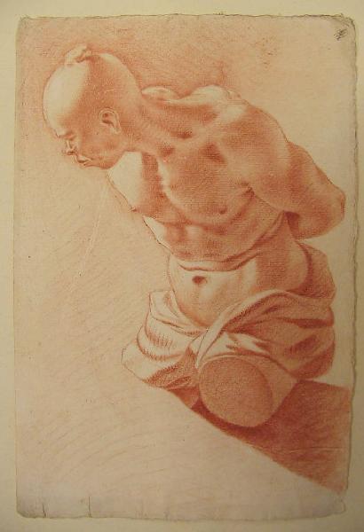 - NOTIZIE STORICO CRITICHE Il disegno è contenuto in una "cartella con 9 schiavi" (n. 107 dell'inventario della donazione al Comune). Gli altri sono quelli schedati N.I.L. 227, 228, 245, 246, 247, 248, 249 e 250: tutti a sanguigna su carta bianca, tutti attribuiti a Pietro ma non tutti dello stesso livello. Almeno alcuni dovrebbero corrispondere a "li 4 schiavi di Livorno (del monumento a Ferdinando I de Medici di Pietro Tacca) con 4 torsi de medemi", annoverati alla voce "studio di riglievi in gesso" nell' "'Inventario dè Fondi, livelli ecc." manoscritto da Pietro fra 1735 e 1737. (c. 54-55). I disegni dovrebbero però collocarsi negli anni dell'apprendistato romano, cioè agli inizi del secolo. E' l'unico disegno della serie in cui compare la ciocca di capelli alla sommità del cranio rasato, tipica dei "4 Mori di Livorno" del Tacca.