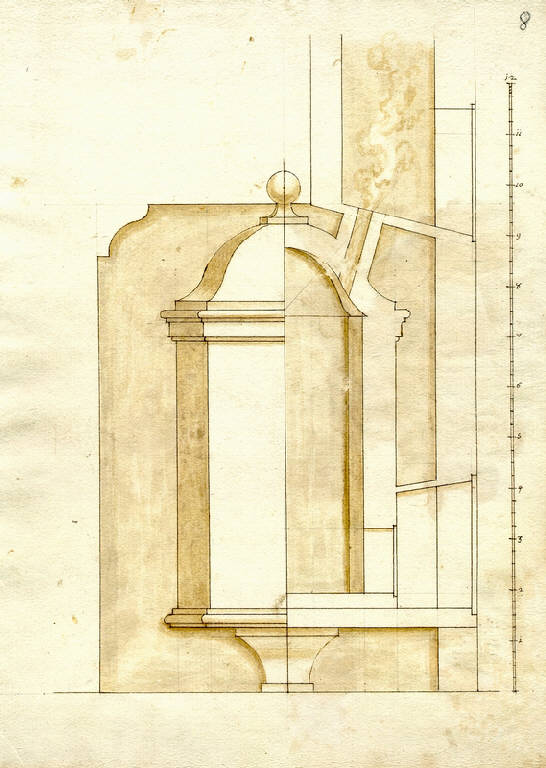 - NOTIZIE STORICO CRITICHE Come specificato dalla scritta del verso si tratta di un "pigna", la tipica stufa valtellinese in muratura, solitamente posta in una stanza foderata in legno detta "stua"; caratteristica della stua è quella di avere la bocca di accensione posta in una stanza attigua. Il Mastro N (c. 67v) menziona il 21 marzo 1733 una "pigna" disegnata per il palazzetto sul Mallero dei Lavizzari di Sondrio. A tale commissione si può riferire il presente disegno, se non alla "pigna" che lo stesso artista disegnò per il proprio studio.