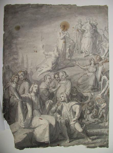 - NOTIZIE STORICO CRITICHE Il disegno è un'interessante testimonianza dell'intrecciarsi di motivi classici e romantici. Il Parnaso è soggetto diffuso nella pittura neoclassica. Oltre a Dante, due personaggi si possono identificare con il Petrarca laureato e con il Boccaccio, entrambi in primo piano, contrassegnati dalle scritte "v. 1340" e "n. 1313". Nel fondo, a sin, un romantico giardino all'inglese. Si noti che, oltre alle Muse, figurazioni della Poesia, compare anche la Pittura. Il disegno corrisponde alla metà sinistra di un quadro a olio della Collezione Boschi di Roma, proveniente per eredità dalla casa dei Ligari.