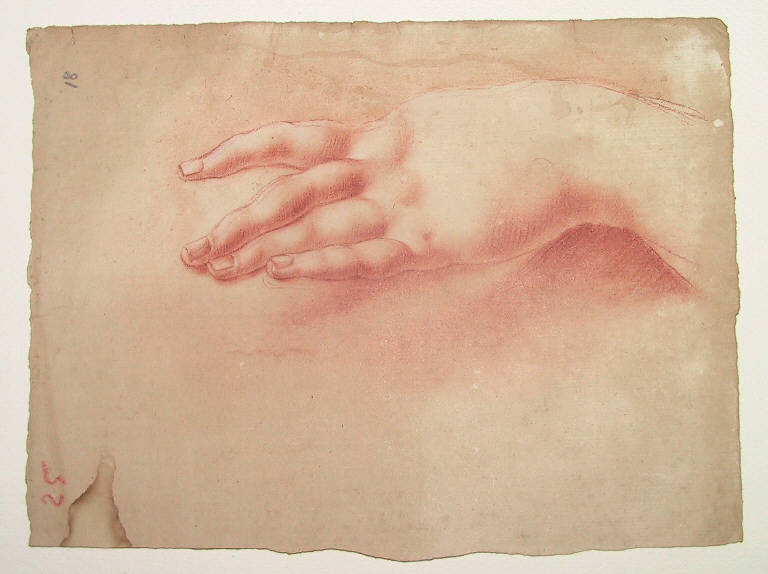 - NOTIZIE STORICO CRITICHE La mano sul recto è quasi identica a quella schedata al N.I.L. 124, che appare evidentemente ripresa da un rilievo di gesso.\nIl disegno sul verso, di qualità scadente, rivela un lavoro didattico di principiante.