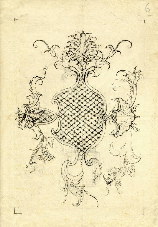 - NOTIZIE STORICO CRITICHE Non è chiaro se questo fantasioso esempio di stile "a grate" sia da leggere in senso orizzontale o verticale. Le appendici decorative asimmetriche forse corrispondono a varianti proposte. Difficile indicarne la destinazione, forse una cancellata o una specchiera. Il disegno ha riscontro in quello schedato al N.I.L. 416.