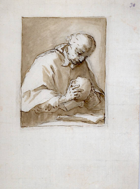 - NOTIZIE STORICO CRITICHE L'Inventario di Pietro annovera due "schizzi": S. Carlo che recita la corona e San Carlo che medita la morte, valutati ciascuno L. 1. E' assai probabile che il secondo corrisponda al presente disegno, che fa coppia con quello schedato al N.I.L. 486, sia per il soggetto, la tecnica e la dimensione della squadratura, sia per il sommesso lirismo.