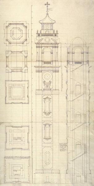 Sezione e prospetto del campanile della chiesa dei Santi Gervasio e Protasio a Sondrio