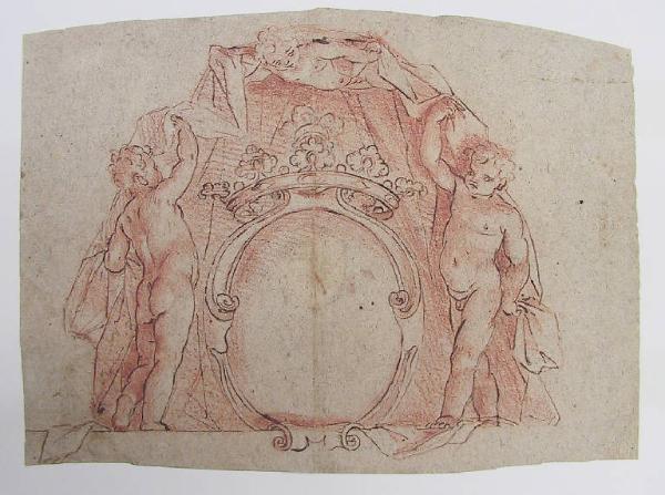 - NOTIZIE STORICO CRITICHE Lo stemma è privo di figura. Sul verso del foglio sono tracciati particolari anatomici di cani. Si attribuisce il disegno a Cesare per la presenza di una tenda sollevata e per i particolari di cani disegnati nel retro del foglio, molto vicini a quelli che compaiono nei dipinti del Ligari figlio.