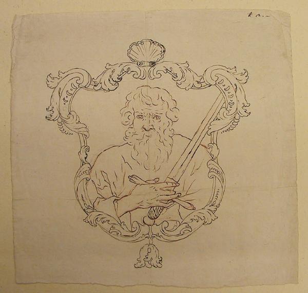 - NOTIZIE STORICO CRITICHE Il disegno sembra più dedicato alla cornice, come a lavoro d'oreficeria, che al personaggio. L'identificazione di quest'ultimo è problematica: escludendo S.Paolo, che reca l'attributo iconografico della spada ma viene rappresentato con fisionomia differente, si può pensare a S.Martino che con la spada divise il proprio mantello. Nell'Inventario Ligari del 1770, al n. 17, è citato infatti un "piccolo quadrettino d'argento indorato di S.Martino, £ 10", a cui può riferirsi il presente disegno.
