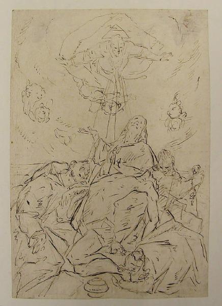 - NOTIZIE STORICO CRITICHE E' certamente un "pensiero" per la pala dipinta in S.Giovanni di Teglio, firmato e datato 1742, dove la composizione è semplificata, ma il gruppo centrale è molto simile: nel disegno però il personaggio di sinistra è S. Francesco, riconoscibile per la piaga stigmatica della mano destra. Un quadro o bozzetto, Addolorata con S.Francesco, al quale parimenti il foglio potrebbe riferirsi, è menzionato nell'Inventario di G.B. Ligari del 1770 al n. 14.