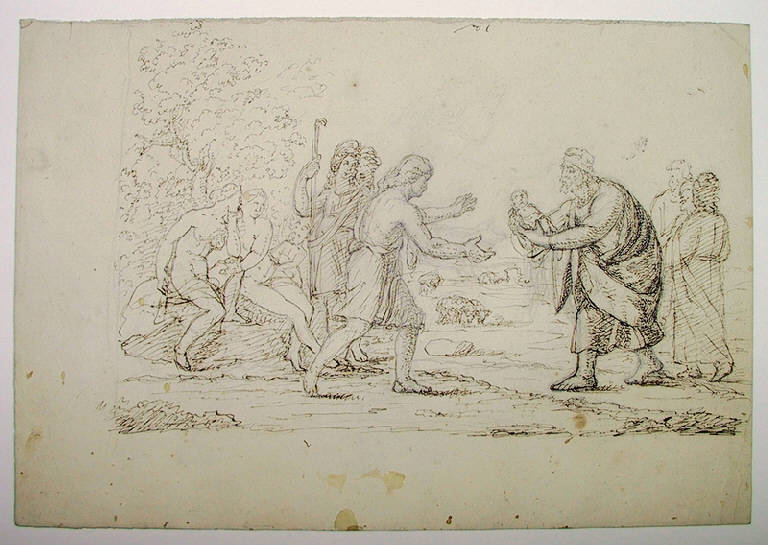 - NOTIZIE STORICO CRITICHE L'identificazione della scena del recto è accertata dalla scritta in calce al disegno, quasi identico ma meno rifinito, a quello schedato al N.I.L. 631. Nel verso il piccolo schizzo dei due personaggi in abiti ottocenteschi richiama le figurine del Sabatelli nel verso del foglio schedato al N.I.L. 565.
