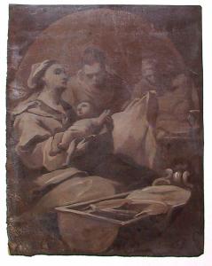 - NOTIZIE STORICO CRITICHE Il monocromo è incollato su un cartoncino insieme a quello schedato al N.I.L. 468. Il soggetto ripete succintamente nelle figure essenziali quello della Natività di Maria di Cedrasco originariamente destinato alla "chiesetta di casa" del palazzo Peregalli di Delebio, dipinta, sembra, ante 1722.. Più che un bozzetto preparatorio, si direbbe un dipinto a sè stante, fra i più belli del gruppo di monocromi ligariani del Museo di Sondrio.