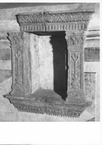 Si tratta della cornice di un vano rettangolare, probabilmente un tabernacolo. La base presenta una decorazione a fuseruola, le lesene una vaso di fiori, la cornice un'ornamentazione a foglie.