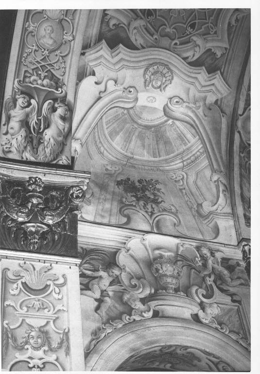 Sopra le arcate è dipinta una conchiglia con un vaso e due angeli con palme. Sulle lesene e sull'arcata verso la navata centrale si svolge una decorazione a arabeschi nastriformi con ovali con busti femminili e due erme alate all'attacco, dipinte in verde.