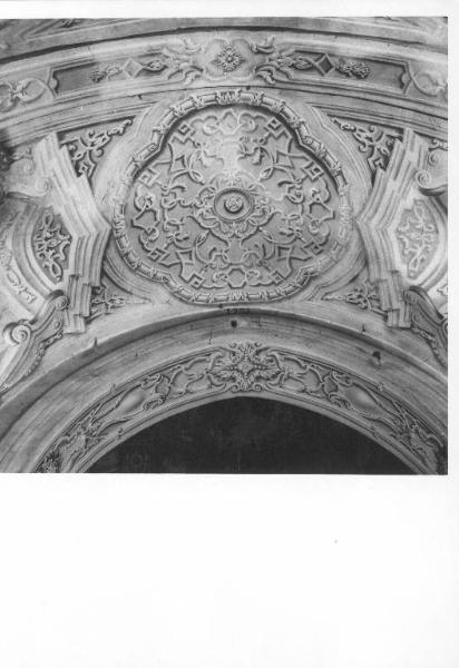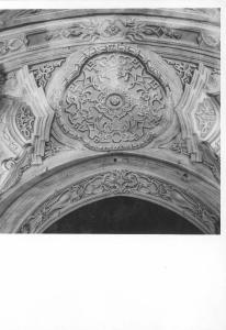 Sui lati in corrispondenza delle unghie della volta, entro una cornice grigia articolata a volute e riccioli è dipinto uno sfondato prospettico con conchiglia al centro. Al centro una campitura mistilinea decorata a arabeschi nastriformi. Il fondo è rosa le quadrature grigie.