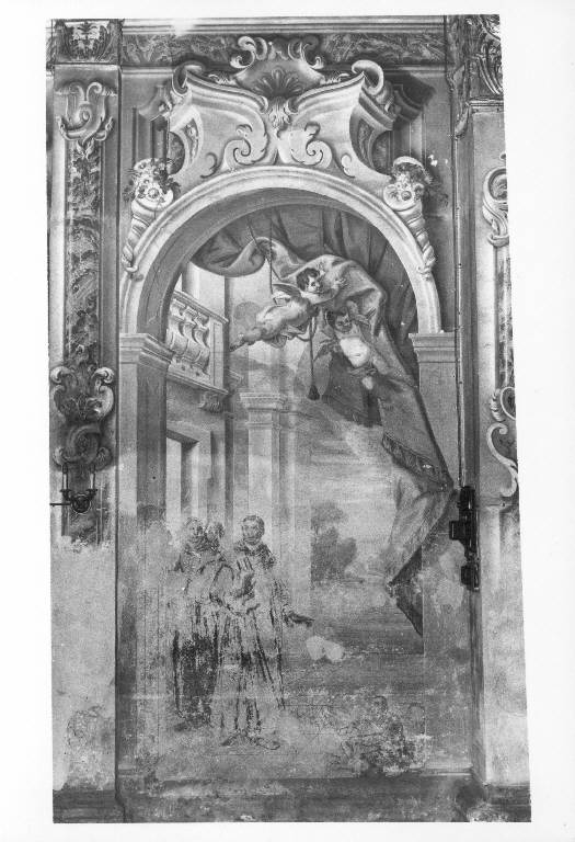 All'interno dell'arcata due angeli alzano una tenda viola pallido sullo scorcio architettonico con tre figure di monaci; a destra è seduto forse un angioletto, ormai illeggibile.