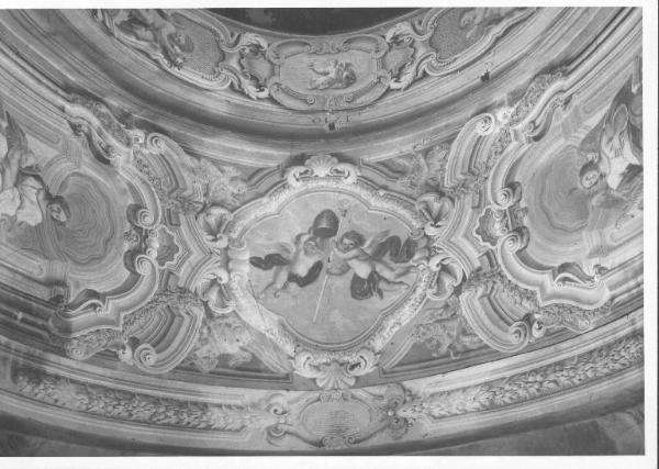 Nel tondo centrale due angeli avvolti in panni rossi reggono insegne pastorali. Nelle due lunette laterali siedono due figure allegoriche. I sottarchi sono decorati con ghirlande di frutta e cartigli su cui sono campiti puttini e una figura femminile. La decorazione prosegue sulle lesene.