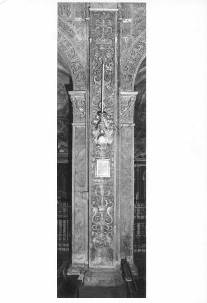 La fronte del contrafforte è decorata da animali fantastici, girali e arabeschi in monocromo grigio su fondo scuro.