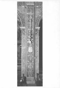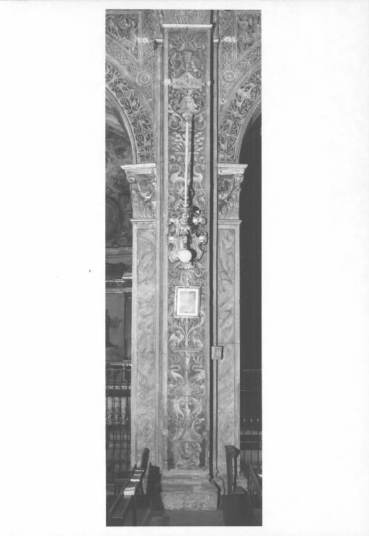 La fronte del contrafforte la decorazione, in monocromo grigio, si articola secondo una successione di animali mostruosi contrapposti ad arabeschi.