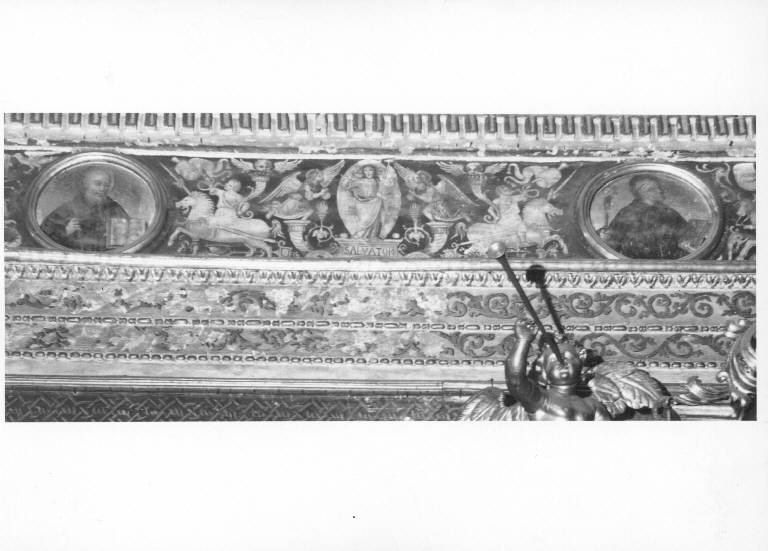 La figurazione centrale con il Cristo e due angeli ritorna in altre zone del fregio; ai lati a sinistra un altare affiancato da due agnelli cavalcati da due giovinetti con cornucopie e libro aperto, a destra una raffigurazione simbolica del carro della morte. Le figurazioni sono in delicati toni di grigio, giallo, rosa e azzurro su fondo scuro. \nCornici lignee dorate intorno al fregio e ai clipei del Santi monaci, cornici in cotto dorato.