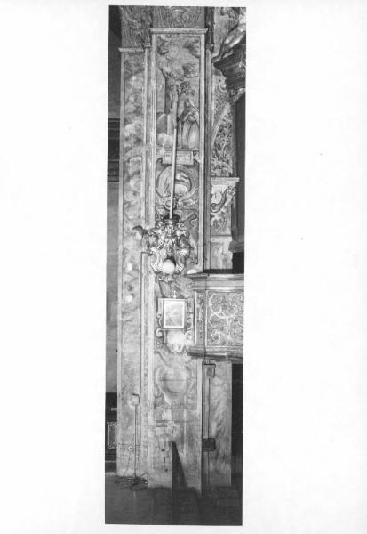 Sulla fronte del pilastro è raffigurata in alto una Santa in abito monacale genuflessa davanti al crocifisso (potrebbe essere S. Monica); seguono l'agnello mistico e una figura maschile, forse un profeta.