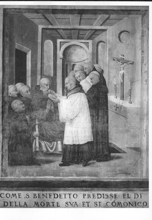 Dopo aver predetto la sua morte, S. Benedetto riceve la comunione circondato dai monaci. La scena ha come sfondo una cappella che si conclude in un'abside semicircolare, con parete su toni rosati e soffitto color senape. In primo piano le sagome scure del saio dei monaci.