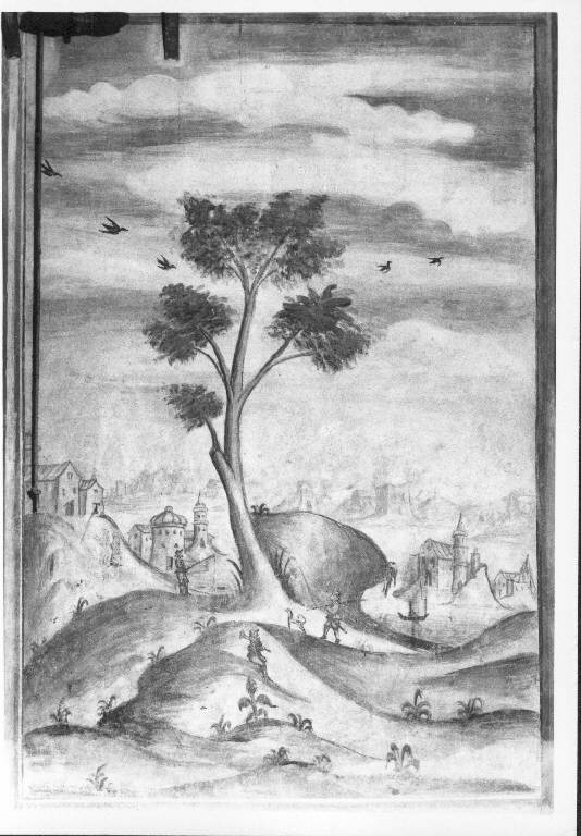 Su morbidi declivi sono disposte piccole figure e tre gruppi di edifici con case di abitazione, chiese e torri; un grande albero si staglia alto sul paesaggio, che è modulato su toni di verdi gialli spenti e di bruni.