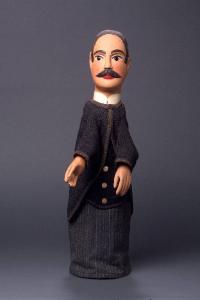 Testa di legno con baffi scolpiti. Dipintura ad olio: incarnato chiaro, guance leggermente più rosa, capelli, sopracciglia, ciglia e baffi marroni, labbra rosse. Occhi di vetro sfaccettato ricavati da spilloni. Piccole scrostature di colore sulle guance e sulla fronte. La parte superiore della testa (capelli) presenta numerosi buchi dovuti a inchiodature precedenti, e una grossa ammaccatura sul lato destro, sopra l'orecchio. La punta del naso è lievemente consumata e scrostata. Colletto bianco, rigido inchiodato. Giacca di lana a falde tonde e spacco sul dietro, color grigio scuro (melange), tutta bordata di fettuccia marrone, foderata di tela nera, cucita in due punti sul davanti. Gilet in panno di lana nero cucito sulla parte anteriore del vestito, bordato inferiormente con fettuccia nera, decorato anteriormente con tre bottoni di materia plastica color beige. Vestito di lana grigia a righine verticali, fissato con sistema a coulisse. (continua in OSS).