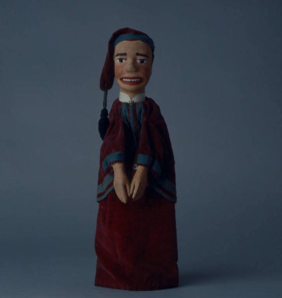Berretto floscio di velluto rosso al quale è fissato mediante traversino verde, un fiocco di lana verde scuro. Bordato alla base con traversino verde chiaro e fissato alla testa con sei chiodi. Testa di legno dipinta a olio: incarnato roseo; capelli, sopracciglia e ciglia marrone; bocca aperta, labbra rosse che lasciano intravedere i denti (scolpiti); occhi di vetro ricavati da spilloni. La guancia destra ha subito un intervento di riparazione, probabilmente ad opera dello stesso burattinaio, un pezzo di legno è stato incastrato e inchiodato per chiudere un buco provocato dall'usura. Colletto bianco rigido incollato al collo. Giacca di velluto rosso con fodera di tela grigia, bordata all'interno con doppia striscia di traversino verde, come ai polsi. Legata al collo con cordoncino e fissata con un chiodo. Gilet di tessuto verde, bordato alle maniche con traversino verde e all'orlo con traversino giallo. (continua in OSS)