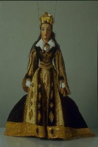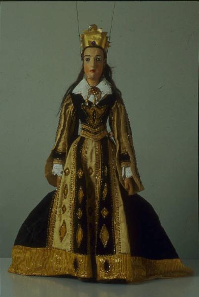 Testa di legno dipinta a olio; colorito roseo, colore molto rovinato sulla fronte e sulle guance. Capelli veri, castani, inchiodati alla testa; diadema di lamiera dorata sottilissima inchiodato alla testa e decorato con residui di grosse pailettes. Alle tempie sono infissi due chiodi per l'aggancio dei fili (probabilmente la marionetta era usata anche con il sistema a bilancere). Il ricchissimo abito è di velluto nero e seta beige. Il colletto è di pizzo bianco fissato sul davanti; il corpetto di velluto bordato di seta è riccamente decorato con corallini di vetro e con tessuto laminato oro. Dal corpetto partono le false maniche, aperte, di velluto bordato con seta e decorato con nastrino laminato oro e corallini di vetro. Le maniche sono di seta beige bordate ai polsi con velluto nero, nastrino e corallini. I polsini sono di pizzo bianco come il colletto. (continua in OSS)