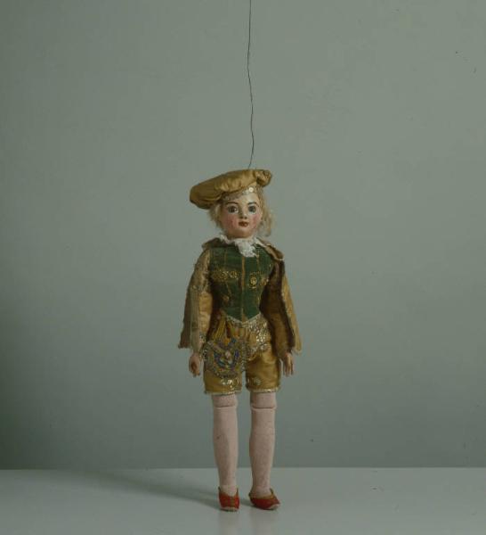 Cappello di foggia quattrocentesca, di seta, color oro, intessuto con lamè e bordato alla base con paillettes metalliche; è inchiodato alla testa in due punti. Testa di legno dipinta in origine ad olio, successivamente ritoccata e verniciata più volte. I capelli sono di materiale sintetico, biondi, inchiodati alla testa. L'incarnato è chiaro con guance rosate. Il colore è scrostato e rovinatissimo su tutta la superficie. Sopracciglia e ciglia marroni come le cavità nasali. Occhi incassati nelle cavità orbitali, probabilmente metallici, poi dipinti. Labbra rosse. Ai lobi sono fissati due anelli per l'eventuale aggancio di orecchini. La testa è articolata al corpo di legno pieno (non articolato). Le gambe sono di legno, articolate al busto e alle ginocchia. Le braccia sono di stoffa imbottita; all'estremità sono fissate le mani di legno. La destra ha pollice e indice piegati come per reggere qualcosa. Un foro passante attraversa il palmo della mano; (continua in OSS)