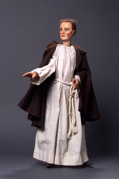 Testa di legno dipinta a olio, incarnato roseo, labbra e guance rosse; sopracciglia e profilo degli occhi marrone; occhi di vetro, a quello sinistro manca la pupilla. Parrucca di capelli veri castani. Corpo di legno privo dell'articolazione del bacino. Braccia di stoffa imbottita, ad esse sono inchiodate le mani di legno dipinte di rosa e con colore scrostato un po' su tutta la superficie. Le gambe sono di legno con articolazione al ginocchio. Il mantello è di tessuto marrone provvisto di cappuccio. La tunica è di cotone bianco, con alti polsi della stessa stoffa. In vita un cordone intrecciato bianco al quale è fissato un rosario con grani di legno intagliato al quale è fissato un piccolo teschio di legno. Le scarpe sono dipinte di nero.