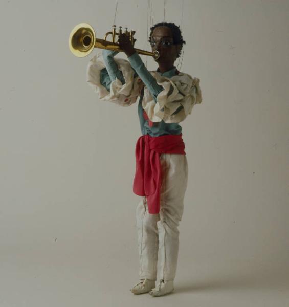 Testa di legno dipinta a olio, colorito bruno; sopracciglia e profilo degli occhi nero; occhi di vetro marroni; labbra rosse; parrucca di lana bouclè. Orecchie intagliate. Tronco e bacino di legno articolati fra loro mediante una fascia di tela inchiodata alle due parti. Braccia di stoffa imbottita alle quali sono inchiodate le mani di legno dipinto. Alle mani, mediante fil di ferro, è fissata la tromba di ottone, realmente funzionante e con tasti forniti di molla interna. Gambe di legno, fissate al bacino con stoffa, provviste di articolazione al ginocchio. Camicia di seta verde con colletto; le maniche hanno cinque balze di tessuto bianco quadrettato, con fodera di seta sintetica bianca. Le balze hanno pois colorati (rossi, gialli, blu, verdi). In vita, fusciacca di seta rossa; i pantaloni di seta bianchi hanno rattoppi alla gamba destra. (continua in OSS)