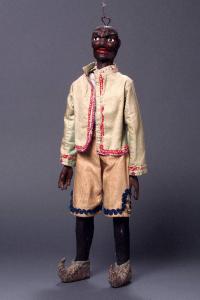La testa, piuttosto antica, è di legno dipinto a olio, color bruno; la bocca socchiusa ha le labbra rosse. Sul volto è intagliata una maschera che ricorda i tratti dell'Arlecchino. Gli occhi sono dipinti, le sopracciglia e i capelli dipinti di nero. Orecchie intagliate. Il corpo è di legno, ma di fattura recente; non è articolato in vita ed è imbottito con gommapiuma. Fattura recente anche per le gambe che sono prive di articolazione al ginocchio. Le mani di legno e dipinte di bruno come la testa, sono più antiche e presentano tra indice e palmo un inserto di fil di ferro sottile per il fissaggio dei fili, quello della mano sinistra è spezzato. L'abito è composto da pettorina della camicia di tela bianca, con colletto. La giacca è di tessuto verde foderato di bianco con collo a pistagna. I bordi della giacca e i polsi sono decorati con cordoncino di lana viola, molto rovinato, e cordoncino di lana rossa e bianca. (continua in OSS)