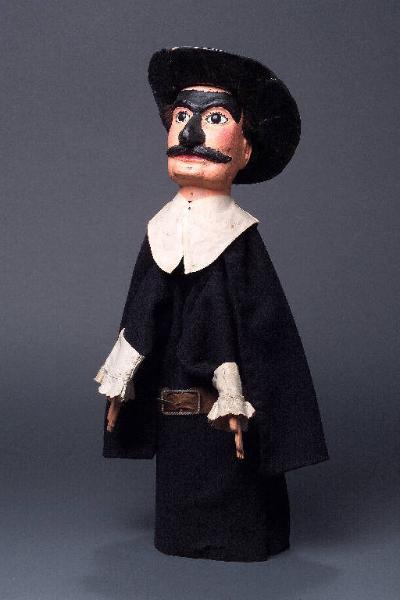 Cappello di cartone rivestito di tela, preparata e dipinta di nero, inchiodato alla testa in due punti; sulla calotta un foro e un grosso chiodo infisso (recente) dal quale partiva lo spago per appenderlo. Testa di legno dipinta ad olio: incarnato roseo, occhi dipinti neri, bocca rossa, baffi (scolpiti) neri, maschera dipinta, nera. Capelli di pelliccia scura. Colletto bianco, di tela, inchodato al collo. Mantello in tessuto di lana nero, inchiodato al collo, con una cintura in vita, di seta marrone e una fibbia metallica. Polsini di cotone bianco operato. Mani di legno inchiodate al buratto e dipinte ad olio.