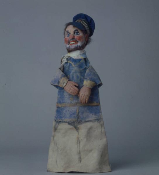Berretto con visiera inchiodato alla testa. Superiormente è di tela blu, piatto e rinforzato internamente con cartoncino, mentre la base e la visiera sono di latta, ricavata da una lattina di "olio Sasso" (base verde a righe bianche e blu; visiera dipinta in grigio per cancellare le scritte). Alla sommità della testa è infissa una cambretta alla quale è legato uno spago per appendere il burattino. Capelli e barba sintetici, rossicci, incollati alla testa. Testa di legno dipinta ad olio: incarnato roseo, orecchie, naso, guance e labbra rossi, ombreggiatura di barba e baffi, sopracciglia e ciglia nere, occhi azzurri. Testa con bocca e occhio destro mobili, cava internamente per contenere il meccanismo: tirando uno spago che fuoriesce dall'imboccatura del buratto il burattino apre la bocca strizzando contemporaneamente l'occhio destro. Sciarpa di tela variopinta, annodata al collo. (continua in OSS)