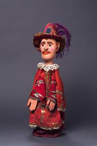 Cappello a tronco di cono con larga tesa, di damasco giallo e rosso, rinforzato internamente di cartoncino, decorato alla base con striscia di passamaneria argentata e, sul davanti, con un ritaglio di velluto blu di forma ellittica, contornato da lustrini argento. Sul lato sinistro è fissata una grande piuma viola. Testa di legno con capelli e sopracciglia scolpiti. Dipintura ad olio: incarnato chiaro, guance rosa, capelli, sopracciglia e baffi marroni, labbra arancioni; occhi di legno, castani. Due fenditure: una, verticale, dietro l'orecchio sinistro, l'altra, rotonda, sotto il mento. Sulla nuca, sopra il cappello, è infissa una cambretta alla quale è fissato uno spago per appendere il burattino. Gorgiera di pizzo bianco, cucita al vestito. (continua in OSS)