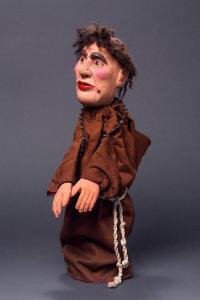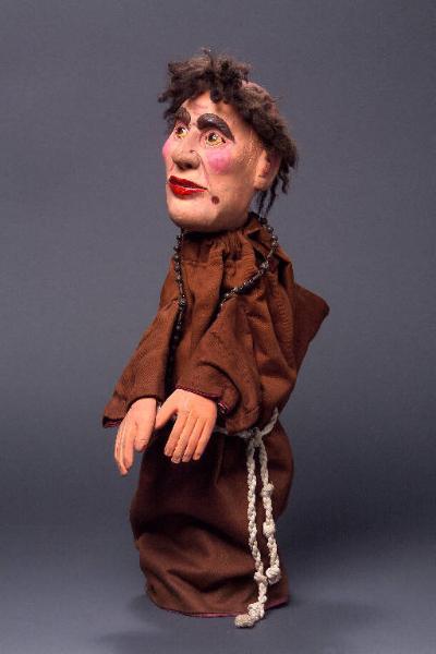 Testa di legno con ampia zona calva cinta da sottile striscia di capelli di pelo animale marrone e lungo, inchiodati intorno. Sopracciglia e pieghe intorno al naso scolpite. Dipintura ad olio: incarnato chiaro, guance e altri segni rosa, sopracciglia, pupille e un neo (all'angolo della bocca) marroni, labbra rosse. Occhi di legno dipinto, rivolti all'insù. Saio con cappuccio molto lungo di cotone marrone, foderato di tela rossa (il cappuccio è privo di fodera), fissato con sistema coulisse (il cappuccio è inchiodato al collo). In vita è cucito un cordone bianco con parecchi nodi e dal cordone scende, sulla destra, una catena per rosario in legno. Buratto di lana marrone scuro, inchiodato al collo e privo di orlo. Mani di legno inchiodate al buratto e dipinte ad olio. Alla sommità della testa è infissa una cambretta, alla quale era legato uno spago, ora mancante, per appendere il burattino.