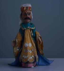 Turbante di cartoncino rivestito di tela a trama larga (garza), parte della quale scende fin sulle spalle, bordato con fascia di tela rossa decorata con passamaneria oro e pietra incastonata, fissato alla testa con tre chiodi, dei quali uno fissa la pietra al turbante. Testa di legno dipinta a olio: incarnato bruno, sopracciglia e ciglia nere (scolorite), labbra rosse. Capelli e baffi veri, castano scuro e neri; i capelli sono cuciti a una calotta di tela nera inchiodata alla testa. Su tutta la superficie innumerevoli buchi prodotti da chiodi. Sul lato sinistro una fenditura che va dalla tempia alla radice del collo. Collare di seta verde foderato, bordato con passamaneria oro, fissata sulla spalla sinistra con grossa paillette lilla e inchiodato al collo. Mantello di seta verde e di fodera azzurra, bordato con passamaneria oro, inchiodato al collo e cucito al vestito. (continua in OSS)