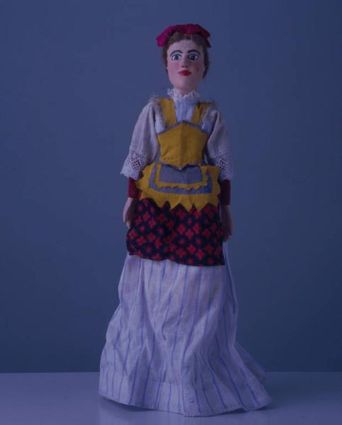 Fiocco di seta rosso porpora inchiodato alla testa. Capelli veri, biondastri, inchiodati alla testa. Testa di legno, rozzamente preparata e dipinta a olio: incarnato roseo, guance rosate, labbra rosse, narici rosse, sopracciglia e ciglia nere. Scrostatura di colore alla guancia destra. Occhi dipinti di nero a smalto. Alle orechie due cambrette per appendervi eventuali orecchini. La testa è fissata al busto di legno e cartone, nel quale è infisso il bastone che consente l'animazione. Al bacino accorgimenti di gommapiuma e velluto per imbottire le forme. Camicia di cotone a righine azzurre con collettino di pizzo, maniche di tela bianca bordate con pizzo. Le braccia sono di velluto rosso, inchiodate alle spalle; alle braccia sono inchiodate le mani di legno, assai rozze, dipinte ad olio magro rosa. Corpetto giallo bordato con nastrino azzurro e ornato di spalline bordate con frangia azzurra. (continua in OSS)