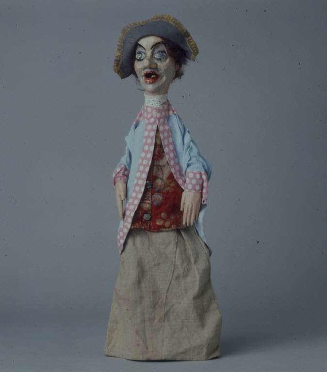 Cappello di feltro grigio, inchiodato alla testa in due punti. La falda anteriore, rivolta verso l'alto, ha una decorazione gialla dipinta; Sulla sommità è infissa una cambretta alla quale è legato lo spago per appendere il burattino. Testa di legno dipinta ad olio, verniciata: incarnato chiaro, sopracciglia e ciglia nere, occhi dipinti (azzurro e nero) di cui uno guercio (il destro), bocca e orecchie rosse (i lobi). Capelli incollati, di fibra sintetica, raccolti in una treccia che cade sulle spalle. Il naso ha una fenditura alla radice, probabilmente perché, in origine, era mobile. Bocca aperta con lingua mobile. Parte del collo è di metallo e nasconde internamente il meccanismo che muove la lingua. La testa è divisa a metà longitudinalmente e riavvitata insieme. Colletto di cotone traforato e inchiodato al collo. Giacca di cotone azzurro con colletto applicato e bordo di cotone rosa a pois bianchi, come ai polsi. (continua in OSS)