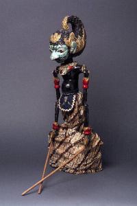 Burattino di legno con asse testa-bastone inserito longitudinalmente nel tronco. Alle spalle sono fissate le braccia, articolate in segmenti, mediante spago; alle mani sono legati due bastoncini che ne permettono l'animazione. Testa di legno con copricapo scolpito a forma di grande ricciolo, dipinto in nero e oro. Incarnato azzurro, capelli, sopracciglia, ciglia, baffi e altri segni neri, collo e mento neri, pupille labbra e lobi delle orecchie rossi. Scrostature di colore su baffi, naso e orecchie. Fenditure verticali sul ricciolo, una sul naso. Busto (la parte visibile) e braccia dipinti in nero: il busto ha un serpente scolpito intorno al collo, dipinto di bianco, nero e rosso e la pancia particolarmente prominente; le braccia presentano decorazioni dipinte in rosso e oro. Il bastone è appuntito all'estremità inferiore. In vita grembiulino e cintura in tessuto blu e nero melange, con decorazioni in passamaneria argentata. (continua in OSS)