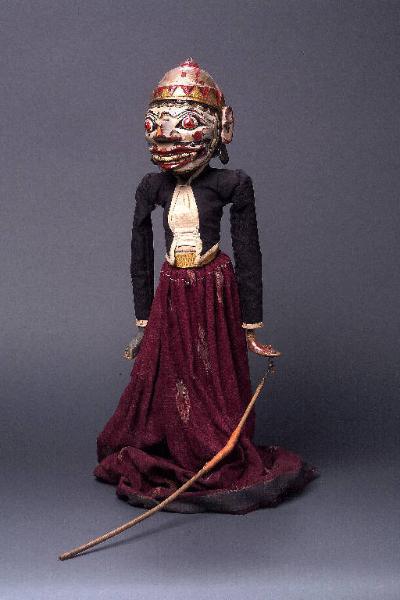 Burattino di legno con asse testa-bastone inserito longitudinalmente nel tronco. Alle spalle sono fissate le braccia, articolate in segmenti, mediante spago. Alla mano sinistra è legato un bastoncino che ne permette l'animazione (spezzato e riattaccato con nastro incollato). Testa di legno con copricapo scolpito, dipinto in grigio, oro, rosso e nero. Incarnato grigio scontornato in nero e oro, sopracciglia, ciglia, baffi e altri segni neri, labbra e pupille rosse, denti bianchi (di cui due, ai lati della bocca, particolarmente appuntiti e sovrapposti al labbro inferiore). Scrostature di colore sulle parti in grigio lasciano apparire una precedente dipintura in rosso. Scalfittura sulla punta del naso. Il bastone all'estremità inferiore è appuntito. Giacca in tessuto lavorato di cotone nero, bordata all'intorno e ai polsi con fettuccia bianca, cucita anteriormente su un corpetto beige (vari strati di tela sovrapposti, che ricoprono il busto). In vita, cintura gialla. (continua in OSS)