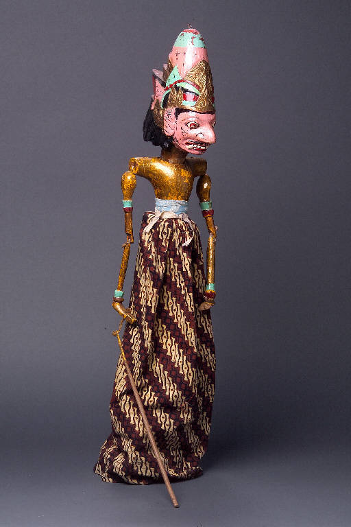 Burattino in legno con asse testa-bastone inserito nel tronco e girevole (in origine: attualmente, mancando il bastone, la testa è fissata alla schina mediante un chiodo). Alle spalle sono fissate le braccia, articolate in segmenti mediante spago. Alla mano destra è legato un bastoncino che ne permette l'animazione. Testa di legno con copricapo scolpito, dipinto di rosa, rosso, verde chiaro, nero e oro. Incarnato acceso, capelli, ciglia, baffi e altri segni neri, pupille e labbra rosse, bocca aperta in un ghigno, con denti visibili, bianchi, profilati di nero. Busto e braccia dipinti in oro, con segni rossi e verdi sulle braccia. La mano sinistra è spezzata. Cintura di cotone azzurro stampato a motivi bianchi. Altra cintura sottile di cotone bianco stampato. Gonna di cotone stampato a motivi bianchi, rossi e neri. Il colore sul legno è fortemente fissato con vernice.