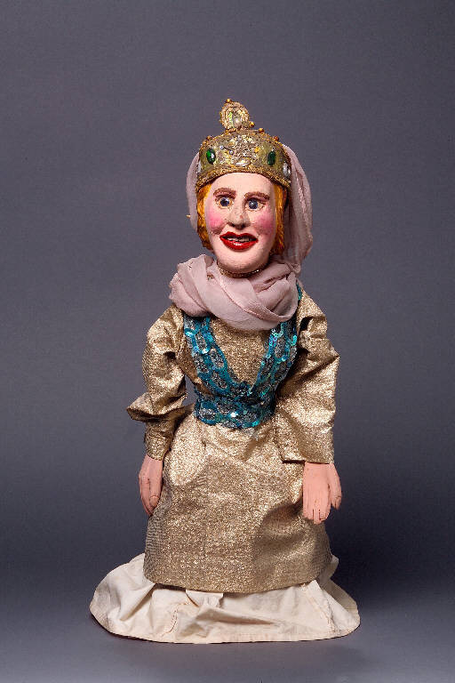 Corona di cartone inchiodata alla testa, rivestita di carta stagnola dorata, decorata con passamaneria e lustrini dorati all'intorno e con false pietre preziose, perline, pezzetti di vetro sparsi su tutta la superficie; anteriormente stella di paillettes e passamaneria dorate. Sotto la corona è inchiodato alla testa un velo di seta rosa che scendendo sulla nuca gira intorno al collo a mo' di sciarpa e termina annodato dietro il collo. Testa di legno con capelli e denti scolpiti (bocca semiaperta). Dipintura ad olio: incarnato chiaro, guance rosa, capelli biondo scuro, sopracciglia e ciglia marroni, labbra rosse, denti bianchi, occhi (dipinti) blu. Scrostature e macchioline sul naso. Corpo di legno piatto e sagomato, imbottito anteriormente e posteriormente con gommapiuma, bastone squadrato, inchiodato al corpo. (continua in OSS)