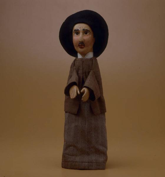 Cappello di feltro nero inchiodato in due punti alla testa. Testa di legno dipinta a olio: incarnato chiaro, guance rosa, capelli, sopracciglia, ciglia e baffi marroni, labbra rosse. Occhi di vetro ricavati da spilloni. Scrostature su tutto il viso, che risaltano particolarmente sulla fronte, le sopracciglia e le labbra; sul naso il colore manca quasi totalmente. In mezzo alla fronte è visibile un foro (inchiodatura precedente) e molti altri se ne trovano sotto il cappello, sparsi su tutta la testa. Colletto bianco, rigido, inchiodato. Giacca di lanetta grigioverde con sottili righine scure, orizzontali, foderata di tela marrone, fissata con sistema coulisse e cucita in un punto sul davanti; originariamente dovevano eservi attaccati due bottoni sul davanti. Vestito di lanetta grigio melange a spina di pesce con righine verdi verticali, foderato di tela blu, bordato all'apertura per le maniche con fettuccia nera, fissato con sistema coulisse. (continua in OSS)