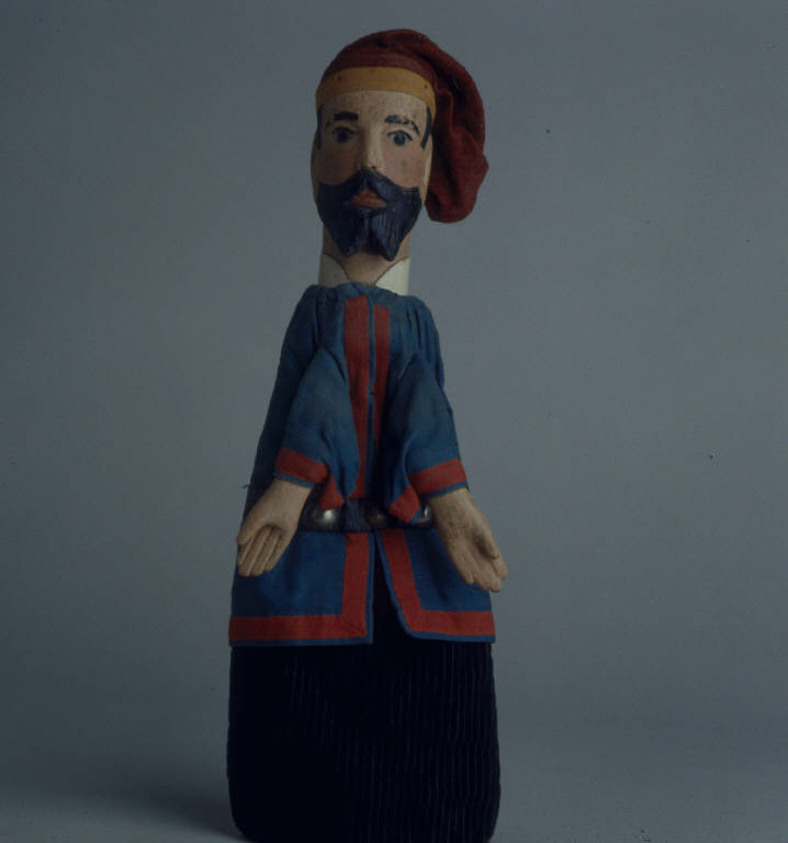 Berretto in tela "spugna" color ruggine, bordato alla base con fettuccia gialla, inchiodato alla testa in molti punti. Testa di legno con barba a due punte e baffi scolpiti. Dipintura ad olio: incarnato chiaro, guance rosa, capelli, sopracciglia, ciglia, barba e baffi neri, labbra rosse. Occhi di vetro sfaccettato ricavati da spilloni. Scrostature di colore, soprattutto sulle sopracciglia e sul naso, che è consumato e scheggiato in punta. Colletto bianco, rigido, inchiodato. Giacca di tela azzurra, bordata all'intorno e ai polsi con fettuccia rossa, foderata di tela grigia e fissata con sistema coulisse. Cintura in finta pelle nera cucita in vita con tre borchie metalliche di forma semisferica e color argento, fissate sul davanti. Vestito bicolore, superiormente di tela color rosso (stinto), inferiormente di velluto a coste verde scuro. (continua in OSS)