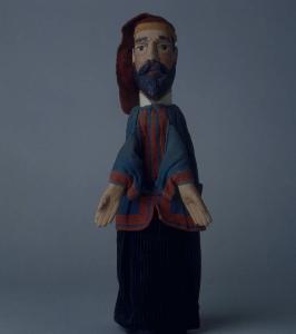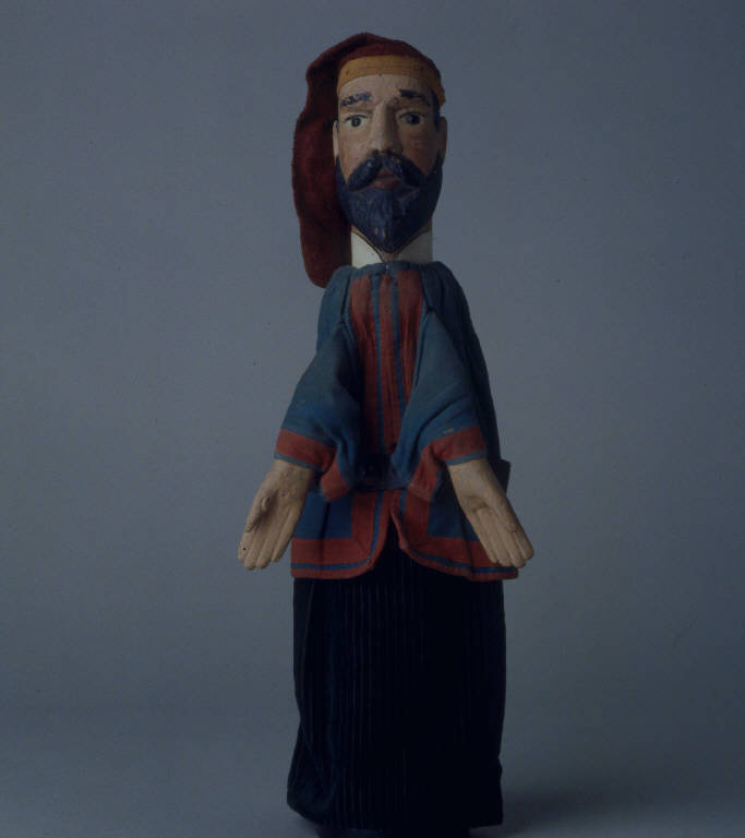 Berretto in tela "spugna" color ruggine, bordato alla base con fettuccia gialla, inchiodato alla testa in più punti. Testa di legno con barba (a punta) e baffi scolpiti. Dipintura ad olio: incarnato chiaro, guance rosa, capelli, sopracciglia, ciglia, barba e baffi neri, labbra rosse. Occhi di vetro ricavati da spilloni. Colore molto scrostato, soprattutto sulle sopracciglia, sul naso e sulle guance. Naso un po' consumato in punta. Colletto bianco, rigido, inchiodato. Giacca di tela azzurra, decorata con doppia striscia di fettuccia rossa che la contorna tutta e una sola striscia della medesima alle maniche, foderata di tela a righe verticali e fissata con sistema coulisse. Cintura in finta pelle nera cucita in vita con due borchie metalliche di forma semisferica, dorate, fissate sul davanti. Vestito bicolore, superiormente in tela lilla, bordata in nero all'apertura delle maniche, inferiormente in velluto a coste verde scuro. (continua in OSS)