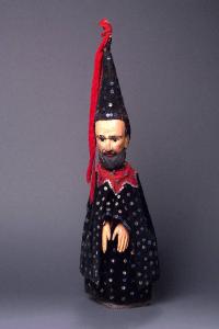 Cappello a cono di notevoli dimensioni, in velluto nero, inchiodato alla testa, rinforzato internamente con cartoncino, adornato di lustrini blu e di nastri rossi legati alla sommità. Capelli neri di finto astrakan, inchiodati alla testa. Testa di legno dipinta ad olio, con baffi e folta barba scolpita. Occhi di vetro ricavati da spilloni. Incarnato chiaro, guance rosa, sopracciglia, ciglia, barba e baffi neri, labbra rosse. Scrostature di colore, soprattutto sul lato destro del viso e sul naso, che è anche un po' scheggiato. Colletino di voile di cotone rosso lobato a sette punte, orlato e adornato di lustrini blu, inchiodato posteriormente. Mantello di velluto nero adornato di lustrini blu, foderato di rasatello rosso fragola, fissato con sistema coulisse. Vestito anch'esso di velluto nero, ornato anteriormente di lustrini blu, foderato di cotone grigio, con maniche dai polsi svasati, fissato con sistema coulisse e inchiodato posteriormente. (continua in OSS)