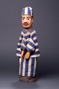 Berretto in cotone felpato arricciato in punta, con estesi rammendi, inchiodato alla testa in quattro punti, a larghe righe bianche e blu; la riga bianca ha al suo interno, due righe marrone chiaro. Testa di legno dipinta d olio, incarnato chiaro, guance rosa, ombreggiatura della barba, capelli, basette, sopracciglia e ciglia neri, labbra rosse. Occhi di vetro ricavati da spilloni. Scrostature di colore su volto e nuca. Il naso è scheggiato ed è stato incollato. Le orecchie sono state inchiodate, anche se non sembrano essere state restaurate. Sopra le orecchie ci sono due scalfitture piuttosto estese e profonde, nascoste dal berretto. Giacca e vestito identici al berretto per materiale e colore; entrambi hanno fodera di tela chiara. La giacca ha il collo arricciato ed è fissata con sistema coulisse assieme al vestito. Le righe della giacca sono orizzontali, quelle del vestito verticali, come sul berretto. Posteriormente il vestito è un po' liso. (continua in OSS)