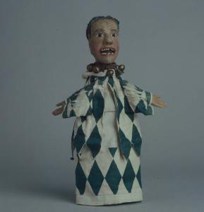 Calottina in organdis verde, molto rovinata, inchiodata alla testa. Capelli di pelo animale grigio, inchiodati alla testa. Testa di legno dipinta ad olio: incarnato chiaro, guance rosa, basette, sopracciglia e ciglia marrone scuro, labbra rosse. Bocca aperta, nella quale sono visibili dieci denti scolpiti e dipinti di bianco. Ombreggiatura della barba. Fronte corrugata e guance solcate da linee curve. Colore in pessimo stato sulla fronte, sul naso e sulle guance. Occhi di vetro ricavati da spilloni. Collare di cuoio fermato posteriormente con una fibbia, al quale sono fissati sette sonagli metallici (sei di forma sferica e uno a forma di campana). Gorgiera di tela bianca, fissata posteriormente con uno spillo. Giacca di raso a losanghe bianche e verdi, foderata di tela bianca, fissata con sistema coulisse; la giacca termina inferiormente con undici punte, a ognuna delle quali è cucito un piccolo sonaglio di metallo (quattro sono mancanti). (continua in OSS)